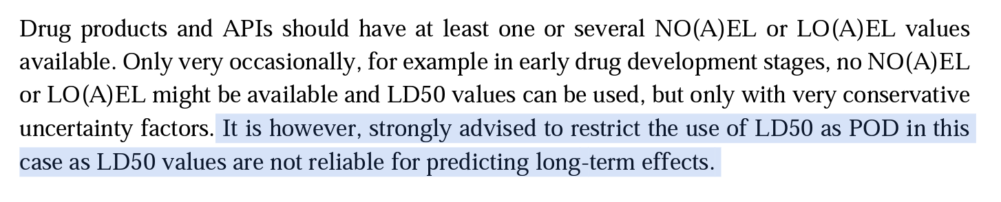 In addition, as shown below, the Active Pharmaceutical Ingredients Committee (APIC) Guidance on Aspects of Cleaning Validation in Active Pharmaceutical Ingredient Plants (rev. April 2019 (updated in February 2021)) strongly advises against the use of the LD50 since these values are not reliable for predicting long-term health effects (p 9-10).