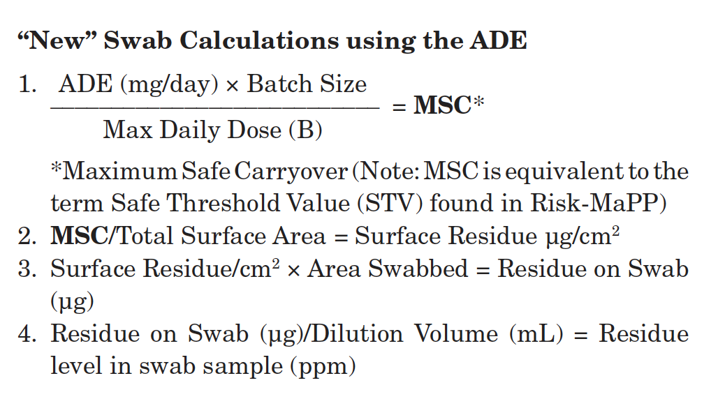 In the past, either 1/1000th of the lowest therapeutic dose or 10 ppm was used as the dose in the maximum allowable carryover (MACO) equation. Now that there are acceptable daily exposure (ADE) values the MACO equation must be slightly modified. Using the ADE (analogous to PDE) is simply a matter of replacing the "Lowest Dose (A)/Safety Factor" with the ADE value in the standard maximum allowable carryover (MACO) equation.