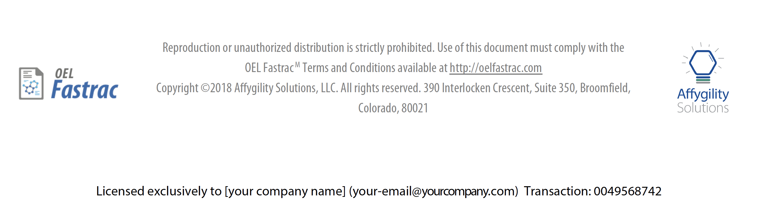 The digital document delivery system that Affygility Solutions uses inserts the company name and email address (i.d.) into the footer of each page of the monograph. In addition, a transaction number is inserted to ensure traceability of the monograph to its rightful purchaser.